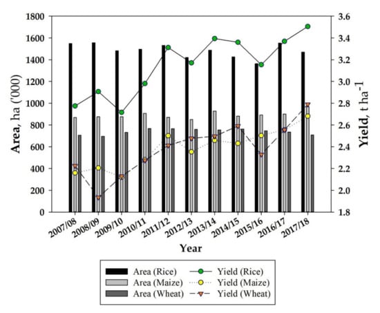 Cereals dominate other crops in Nepal, with a 49.4% share in agriculture GDP [40]. Rice (also known as paddy) is a principal crop among other major cereals because of its area of cultivation and yield (Figure 1). It shares 42.5% in total cereal cropped area, 51.6% in cereal food production, and contributes 20% in agriculture GDP. Maize, wheat, millet, barley, and buckwheat are other cereal crops grown mostly in rainfed conditions and in the mid-hill regions where irrigation development is lower [41,42]. Cereal production in Nepal is among the lowest in South Asia [40]. It has a lower yield than Bhutan, India, and other South Asian countries except for Afghanistan and Maldives [43]. Production of food crops is mainly dependent on timely and adequate monsoons, as only one-third of cultivated land has assured irrigation facilities [44]. Therefore, Nepal has been a major importer of rice a staple food crop. Nepal imported 531,000 tons of rice, amounting to $210 million in 2015 [45]. However, in the recent decade (2007–2018), the yield of major cereals has shown an increasing trend while the area of rice and wheat cultivation shows decreasing. In contrast, maize cultivation area has increased in recent days [46]. Adoption of improved and hybrid varieties and better inputs (chemical fertilizer and irrigation) and technical know-how among growers have contributed to increased production of cereals [47].