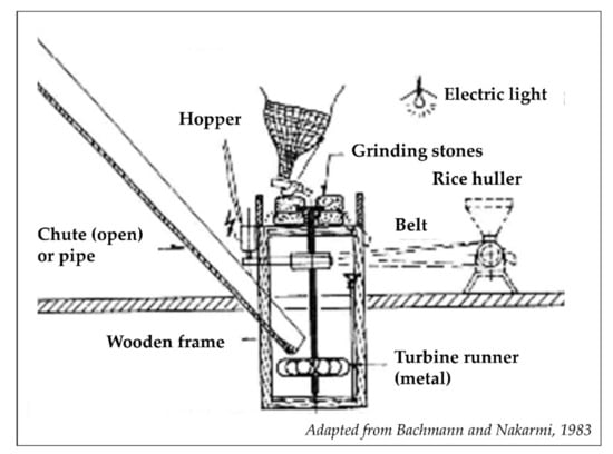 Water resources, for a long time, have been utilized for generating energy in Nepal. The rural water mill system in Nepal is one of its traditional examples [71]. The watermill utilizes the potential energy of water, converts it into kinetic energy by dropping water from some height that makes a water jet, which then turns the paddle, generating rotating energy (Figure 3). This rotating energy is used for grinding grains by attaching a grinding stone coupled at the top of rotating shaft. The improved design of the traditional watermill has better efficiency in grinding grains, hulls, rice, and can produce 3–5 KW of electricity. It has been estimated that about 30,000 traditional watermills are running in Nepal. However, the number tends to decrease due to urbanization and mechanization (e.g., introduction of diesel-powered machines). Water mills in Nepal have improved lives, reduced workload of women, and supported income generation activities of rural people. In addition to this, improved the water mill has been integrating the irrigation facility by sharing water mill canals for irrigation purpose, making it irrigation, agro-processing, and electricity generation services [72].
