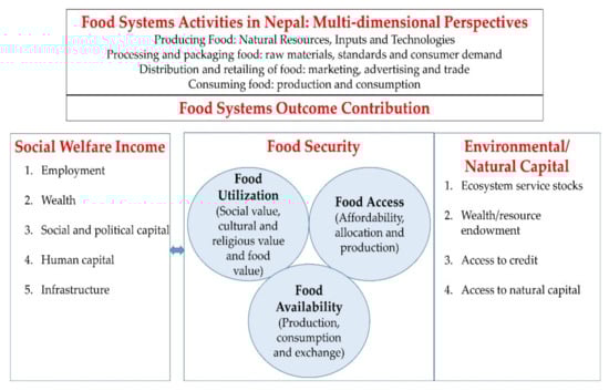 A food system enabled with a large amount of agronomical research in the past led to an almost three-folds increase in productivity of major cereals, coarse grains, root crops, livestock, and fisheries to feed the growing population [1,2,3]. These achievements in advancement of food production, however, had been made possible at large environmental costs that resulted in loss of biodiversity and agro-biodiversity and depletion of essential natural resources such as water, land, and native agriculture gene pools including their wild relatives in nature [1,4,5]. Today about 820 million people are suffering from hunger and malnutrition deficiency [6]. The rising population will reach 9 billion in the next three decades, putting additional pressure on these resources [7]. The scarcity of natural resources necessary to produce additional food will lead to a rise in world food prices, consequences of which may leave a significant amount of the population undernourished [8]. The disparity in food security is seen present today, like Sub-Saharan Africa and South Asia, which are severely affected by hunger problems compared to the other regions and post-COVID-19 situation looks even bleaker [9]. The Global Hunger Index 2019 for South Asia and Africa South of the Sahara shows a higher proportion of population undernourished as well as high prevalence of stunting and wasting among children [10]. A South Asian country, Nepal ranks at 79th position among 113 countries on food security index and has been struggling with food insecurity for a long time [11]. Since food security is the outcome of a food system [12], this factor points to a need for interdisciplinary thinking on food system planning as already postulated in recent Global Environmental Change reports and Food System concept [13,14]. Simpson and Jewitt [15] highlighted the importance of resource security to gain sustainability in all the four dimensions of food security, i.e., food availability, accessibility, utilization, and stability in a situation of vast growing population and climate change.