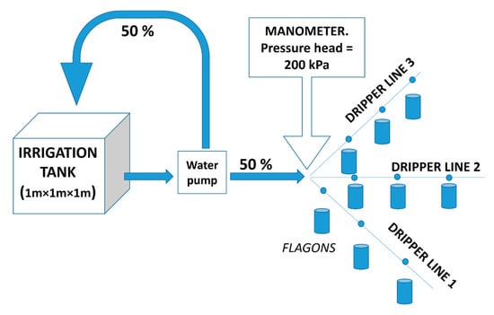 One irrigation cycle per day was performed, the irrigation cycles began with the tap water and continued with each increasing concentration of the digestate to avoid contamination. Each water-HF-DLF mixture was prepared mixing the relevant amount of tap water and HF-DLF in an operating tank and reflushing it several times with the pump. The water pump used was set at 0.2 MPa operating pressure, and the irrigation tank was filled with 400 L of DLF. Before starting each test, three samples were collected from the irrigation tank to measure the dry matter and the pH of the solution, following the methodology described above. In addition, flushing with tap water was performed by 15 min at the end of each cycle to allow for the cleaning the system. A pre-flushing was also made before the beginning of the first experiment with tap water. Within each irrigation cycle, the pump recycled part of the water or diluted HF-DLF into the tank to keep it mixed and avoid particle deposition. The irrigation system was organized by three polyethylene 1-m long dripper tubes (Stocker company N°26085, Bozen, Italy), as replicates, with three emitters each. The dripper tubes used had 0.016 m of diameter (maximum design pressure 0.4 MPa) and were spaced 0.33 m each other. Water flow declared by the manufacturer was 2 L h−1. Emitters were not changed from each cycle to the following one.