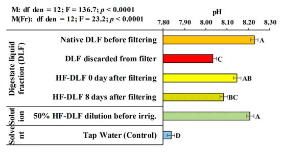 Values of pH of the digestate liquid fraction (DLF), before and after hydrocyclone filtering (HF), the 50% dilution of the HF-DLF, and the tap water used for the experiment. Bares are least square means (LSmeans) ± Lsmeans standard error estimates. Bars with a letter in common cannot be considered different according to a conservative Tukey-grouping applied to the p-differences of the LSmeans. Results of the statistical analysis are embedded.