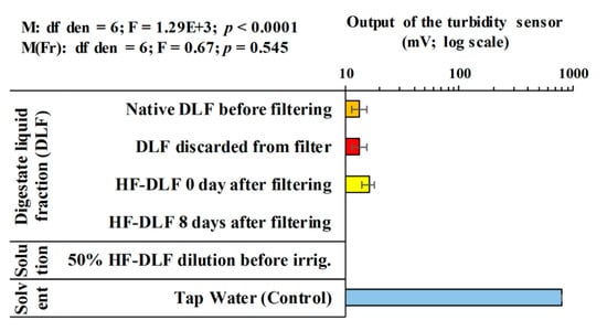 Output of the turbidity sensor in the digestate liquid fraction (DLF), before and after hydrocyclone filtering (HF), the 50% dilution of the HF-DLF, and the tap water used for the experiment. Bars are LSmeans ± Lsmeans standard error estimates. Bars with a letter in common cannot be considered different according to a conservative Tukey-grouping applied to the p-differences of the LSmeans. Results of the statistical analysis are embedded.