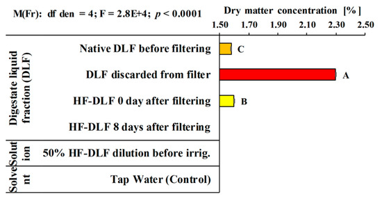 Dry matter concentration of the digestate liquid fraction (DLF), before and after hydrocyclone filtering (HF), the 50% dilution of the HF-DLF, and the tap water used for the experiment. Bars are LSmeans ± Lsmeans standard error estimates. Bars with a letter in common cannot be considered different according to a conservative Tukey-grouping applied to the p-differences of the LSmeans. Results of the statistical analysis are embedded.