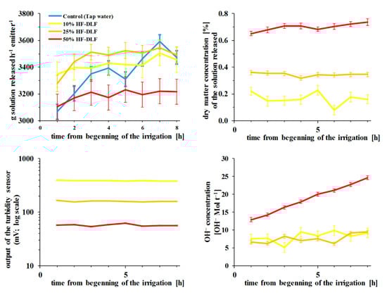 Amount of solution (tap water in the control and digestate liquid fractions (HF-DLF) diluted at the 10%, 25%, and 50%) released by the emitter each hour (upper left panel); dry matter concentration of the DLF released (upper right panel); turbidity of the HF-DLF released (lower left panel); and amount of OH− ions released per ton of water released each hour. Data are LSmeans ± LSmeans standard error estimates. For post-hoc comparisons and raw data see Supplementary Material Table S3.