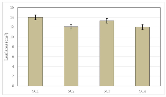 As shown in Figure 5, the highest mean value of leaf area, equal to 14 cm2, was obtained with SC1 (vermicompost), while the lowest mean value, equal to 12 cm2, was obtained with SC4 (100% peat). The differences between the mean values of leaf area were not statistically significant (p = 0.363), so that the influence of the substrate compositions alternative to peat was not significant on leaf area.