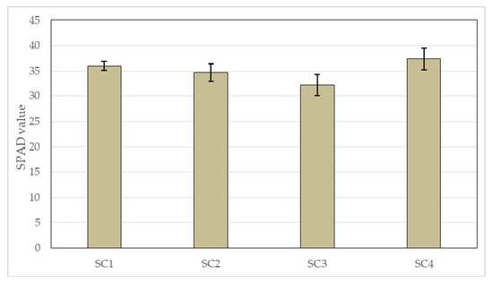 Figure 6 shows the mean SPAD values obtained with the four substrate compositions (SC). Statistically non-significant mean values (p = 0.821) were obtained with SC3 (digestate) in comparison with those obtained with SC4 (100% peat). Moreover, different but not statistically significant mean values (p = 0.901) were obtained with SC1 (vermicompost) and SC2 (compost) in comparison with those obtained with SC4 (100% peat).