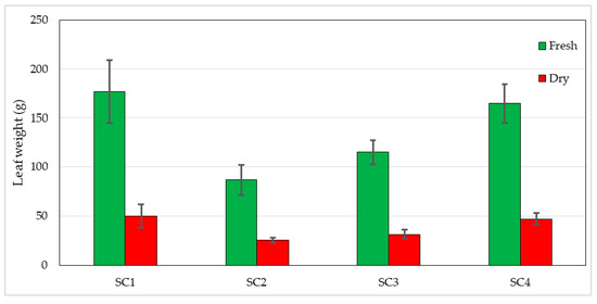 The mean values of leaf weight obtained with the four substrate compositions are compared in Figure 7. Fresh leaf weight was 177 g with SC1 (vermicompost) and was similar to that of SC4 (100% peat). The lowest mean value, equal to 87 g, was obtained with SC2 (compost). The mean values of SC2 (compost) and SC3 (digestate) were lower than those obtained with SC1 and SC4. Therefore, both compost and digestate did not allow a high level of leaf growth. The mean values of both fresh and dry leaf weight obtained with SC1 (vermicompost) and SC4 (100% peat) were similar to each other and much higher than the mean values obtained with SC2 (compost) and SC3 (digestate).