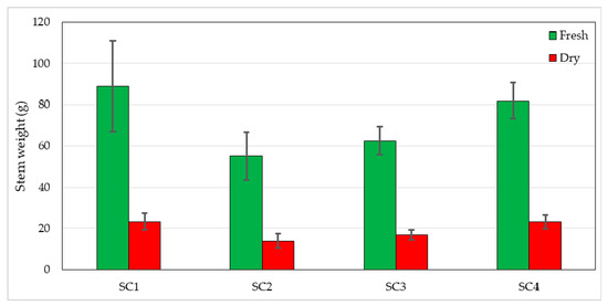 The mean values of fresh and dry stem weight obtained with the four substrate compositions are shown in Figure 8. The highest mean value of fresh stem weight, equal to 89 g, was obtained with SC1 (vermicompost) but it is not statistically significant (p = 0.180) in comparison with the mean values obtained with SC4 (100% peat). The lowest values of fresh stem weight were obtained with SC2 (compost) and SC3 (digestate) and were statistically significant, so that they negatively influenced this biometric parameter.