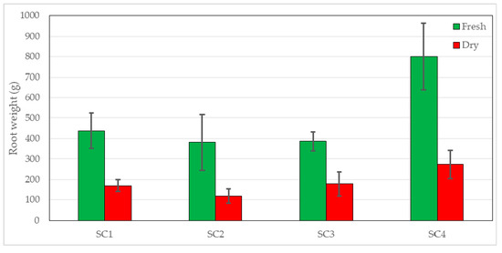 The mean values of fresh and dry root weight obtained with the four substrate compositions are compared in Figure 9. The highest mean values of fresh root (800 g) and dry root weight (272 g) were obtained with SC4 (100% peat). These values (both fresh and dry roots) were higher than those obtained with SC1, SC2 and SC3. These differences were not statistically significant (p = 0.256), so that all of the tested substrates alternative to peat negatively influenced this biometric parameter.
