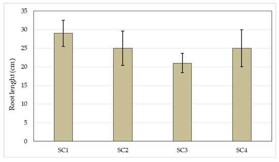 As shown in Figure 10, the highest mean value of root length, equal to 29 cm, was obtained with SC1 (vermicompost), while the lowest mean value, equal to 21 cm, was obtained with SC3 (digestate). The mean value obtained with SC1 (vermicompost) was 4 cm higher (+16%) compared to that achieved with SC4 (100% peat). Instead, the mean value obtained with SC2 (compost) was equal to that achieved with SC4. Finally, the mean value obtained with SC3 (digestate) was 4 cm lower (−16%) than that achieved with SC4. Therefore, vermicompost positively influenced the root growth, while digestate negatively affected it.