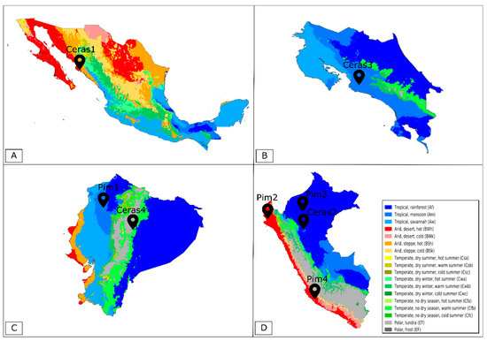 Köppen-Geiger climate classification map of Mexico (A), Costa Rica (B), Ecuador (C) and Peru (D) with the collection sites of the eight tomato accessions used in this study marked. Adapted from Beck et al. (2018) [39].