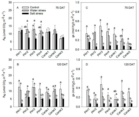 At the genotype’s level, the photosynthetic rate (AN) was not significantly affected by water deficit at 75 DAT for any accession (Figure 2A) when compared to control conditions. At the end of the experiment (120 DAT), AN decreased in Pim4 and Ceras3 water-stressed plants (59% and 50%, respectively) when compared with control plants, while it increased by 64% in Pim2 accession. The effect of salt stress on AN at 75 DAT was higher compared with water stress, reducing AN in three Pim accessions (Pim2, Pim3, and Pim4) (Figure 2A). At 120 DAT (Figure 2B), salt stress provoked a significant reduction in AN ranging from 47% to 84% in all of the studied accessions, and particularly in Pim1 salt-treated plants (84%). Only AN in Pim2 accession under salinity did not show significant differences at 120 DAT when compared with control plants (Figure 2B).