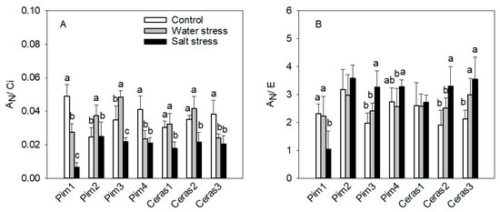Pim3, Ceras2, and Ceras3 under salt-stressed plants registered higher AN/E values than control plants (65%, 74%, and 67% increase, respectively), while this ratio was not significantly affected in Pim2, Pim4, and Ceras1 salt-treated plants. On the contrary, Pim1 salt-stressed plants registered the highest decrease (55%) when compared with its control (Figure 3B).