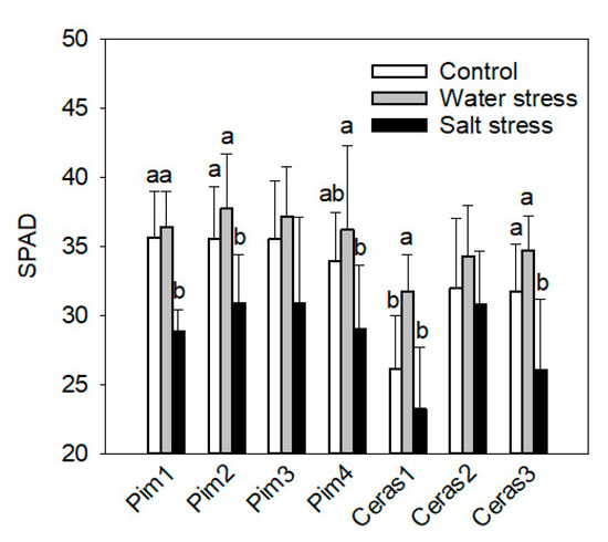 Two accessions (Pim3 and Ceras2) did not show significant differences either under salt stress conditions or under water stress when compared with respective controls.