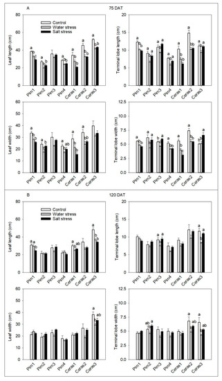 Leaf and terminal lobe length and width (cm) in accessions Pim1, Pim2, Pim3, Pim4, Ceras1, Ceras2, and Ceras3 under control, water stress and salt treatment after 75 (A) and 120 (B) days of treatment (DAT). Data are mean values ± SE for n = 8 plants. Within each accession, different letters indicate significant differences at p < 0.05 (LSD test). Analysis of two-way ANOVA is provided in supplementary material in Table S4. SE: Standard error.