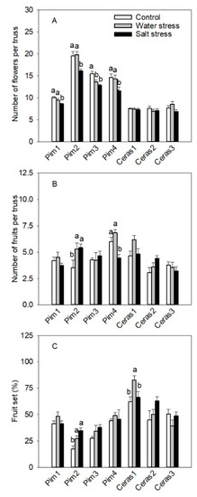 Regarding salt-treated S. pimpinellifolium, all genotypes showed fewer flowers per truss compared with control plants (Figure 7A). In addition, the number of fruits per truss increased in the case of Pim2, decreased in Pim4 and remained unalterable in the rest of accessions (Figure 6B). Finally, fruit set was significantly increased for Pim2 (Figure 6C). Regarding S. l. var. cerasiforme accessions, there were no significant differences between salt and control treatments in any parameters (Figure 6A–C).