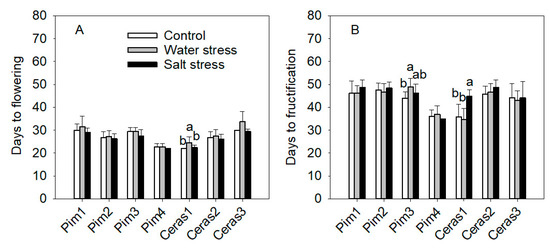 Most accessions started to flower around 27 days after the beginning of the experiment (Figure 7A). Regarding treatments, there was not a significant effect of water and salinity stress on this trait. Only Ceras1 plants grown under water stress presented a statistically significant delay of 3 days on the days to flowering when compared to control plants (Figure 8A). Similar behavior was observed in the days to fructification (Figure 7B). Only Pim3 plants grown under water stress presented a statistically significant delay of 5 days on the days to fructification when compared to their corresponding control plants. Under salt stress only Ceras1 plants presented a statistically significant delay of nine days to fructification when compared to their corresponding control plants and water stress (Figure 7B).