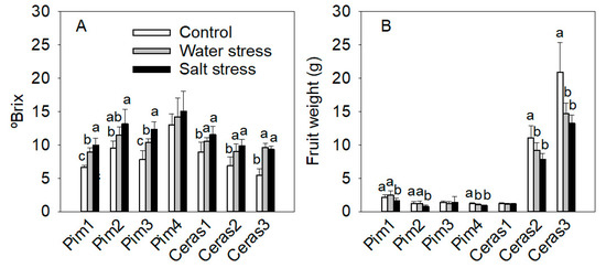 Total soluble solids content was positively affected by both stress treatments in most accessions, compared to control conditions (between 21% and 28% average increase, for water and salt stresses, respectively). In fact, only Pim4 was not significantly affected by any of the treatments (Figure 8A). This accession showed the highest average ° Brix under the three treatments. Salt treatment showed the highest °Brix values, followed by water stress and then control. In addition, accessions Ceras2 and Ceras3 showed no differences between both stress treatments, accession Pim2 was not significantly affected by the water stress treatment (Figure 8A).