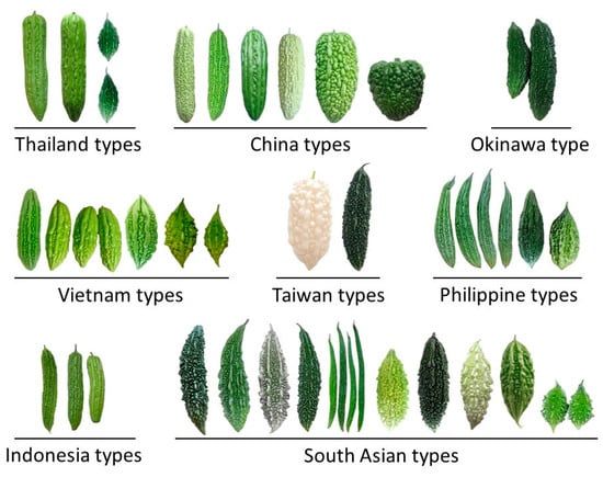 Consumer preferences for the color, shape, skin pattern, and size of bitter gourd fruit vary between and within countries. Fruit colors range from white or cream to light green and dark green, and shapes include cylindrical, elliptical, spindle, and conical types. Fruits develop irregular longitudinal ridges and warty skin, depending on the cultivar. Nearly 28 bitter gourd fruit types are consumed in Asia (Figure 1) and these are found in eight major markets including Thailand (2 types), China (6 types), Okinawa (1 type), Vietnam (2 types), Taiwan (2 types), Philippine (2 types), and Indonesia (3 types), and in the South Asian market there are 10 types of fruit that are popular in India, Bangladesh, Pakistan, Sri Lanka, and Nepal. Asian consumers cook bitter gourd fruits with other vegetables (potato, onion, garlic), stuffed or stir-fired, or add them (the white fruit) to soups to produce a slightly bitter flavor. The fruit is also widely used for making chips, especially in southern India. Bitter gourd tea prepared from dried fruits is a popular health drink in Japan and some other Asian countries.