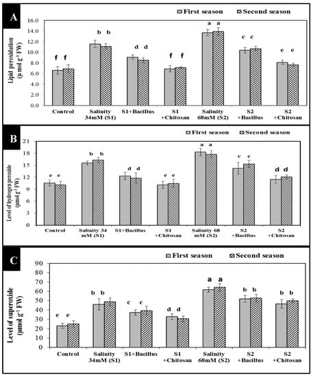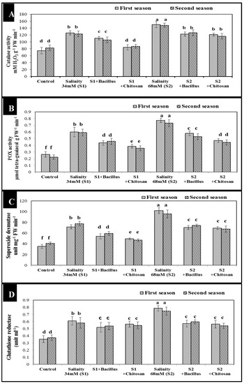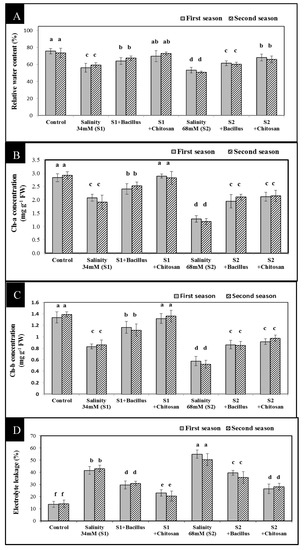 - Hafez, Y.; Attia, K.; Alamery, S.; Ghazy, A.; Al-Doss, A.; Ibrahim, E.; Rashwan, E.; El-Maghraby, L.; Awad, A.; Abdelaal, K.A. Beneficial Effects of Biochar and Chitosan on Antioxidative Capacity, Osmolytes Accumulation, and Anatomical Characters of Water-Stressed Barley Plants. Agronomy 2020, 10, 630. [Google Scholar] [CrossRef]