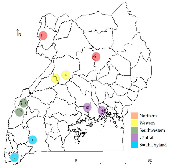 Map of Uganda showing Brachiaria ecotype collection sites in five regions (regions are coded in different colors). The map was generated using DIVA-GIS software.