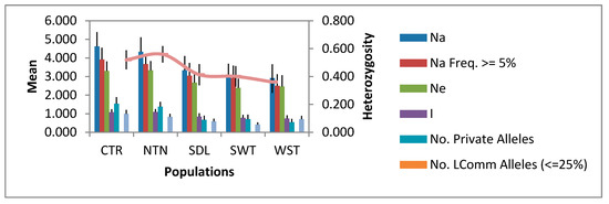 Allelic patterns across the study populations of Brachiaria grass ecotypes in Uganda. CTR = central, NTN = northern, SDL = southern dryland, SWT = southwestern, and WST = western. Na = number of different alleles, Ne = number of effective alleles, and I = Shannon information index.