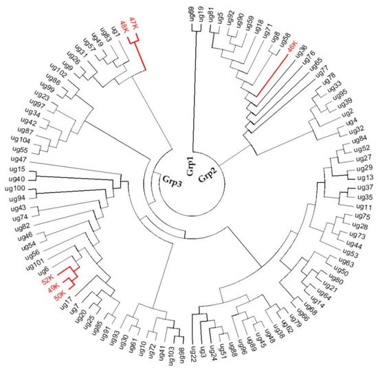 Neighbor-joining tree of 99 Brachiaria ecotypes from Uganda and six commercial cultivars based on Rogers’s genetic distance calculated from 24 simple sequence repeats markers. Ecotypes are denoted by initial letters ug and commercial cultivars are written in red color as 46 K (Brachiaria humidicola cv. Humidicola), 47 K (Brachiaria brizantha cv. MG4), 48 K (Brachiaria brizantha cv. Piata), 49 K (Brachiaria hybrid Mulato II), 50 K (Brachiaria humidicola cv. Llanero), and 52 K (Brachiaria decumbens cv. Basilisk).