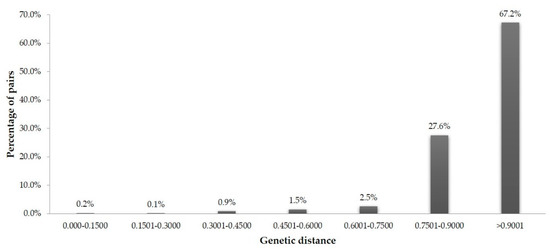 The pairwise Rogers genetic distance for 99 Brachiaria ecotypes showed a wide range of genetic differences (≤0.1500 to over ≥0.9001) among the ecotype pairs (Figure 4). About 67.2% of the ecotype pairs had a genetic distance of over 0.9001, 27.6% pairs had a genetic distance between 0.7501 and 0.9000, while 5.2% pairs had a genetic distance of ≤0.7500.