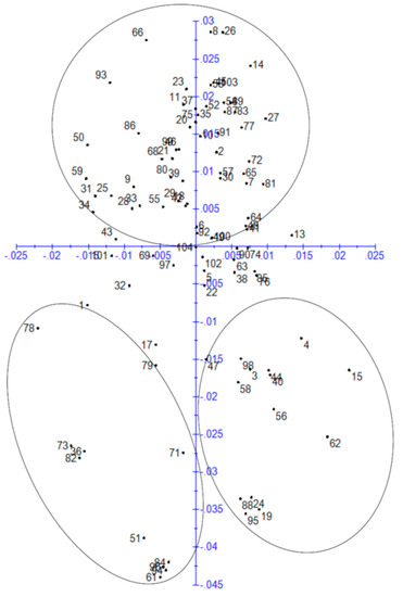 The genetic relationships among ecotypes were visualized through principal component analysis. Principal component analysis based on allele frequencies generated from 24 SSR markers detected three-major groupings of 99 ecotypes (Figure 5). The percentage variation explained by PC1 and PC2 were 40.6% and 18.2%, respectively.