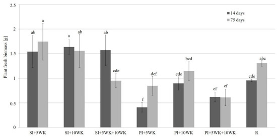 With regard to soil inoculation (SI), a significant increase in the growth efficiency index (13.3%) was only observed in soil inoculated with 5WK. In respect of pre-inoculation of the grains (PI), an increased plant biomass was detected after inoculation with the single strains (PI + 5WK and PI + 10WK) (Figure 1). The value of growth indices calculated for these treatments was 106.1% and 28% EI, respectively. In turn, the value of ryegrass growth index in the treatment without inoculation (R) was 36.4% EI. In general, plant biomasses were influenced by the inoculum applied (single strains or consortium). Nevertheless, plant growth and biomass production were lower when the PI method was used (Figure 1). Moreover, the statistical analysis did not show the differences between plant weights in all treatments (Figure 2).