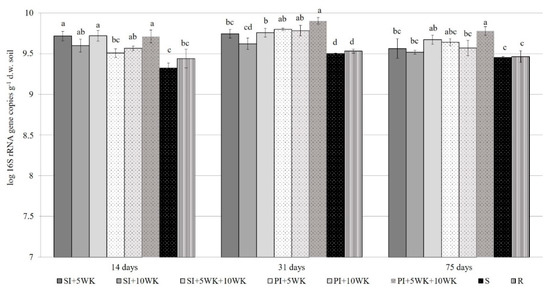 The identify numbers of 16S rRNA gene copies allowed the determination of the effects of the introduced strains 5WK and 10WK on the autochthonous community in the polluted soil (Figure 2). In order to assess the differences in the numbers of copies of the 16S rRNA gene in the soil between the different treatments on days 14, 31 and 75, one-way ANOVA and post-hoc Tukey’s tests p < 0.05 were performed (Figure 2). On days 14, 31 and 75, no significant differences in the average numbers of copies of the 16S rRNA gene were detected between the noninoculated soils (R) with or without plants (S) growing on it. On day 14, the content of the 16S rRNA gene was significantly (p < 0.05) higher in soil where a consortium of the strains was applied (SI + 5WK + 10WK; PI + 5WK + 10WK) compared to the noninoculated soil (R, S). A significantly higher amount of 16S rRNA genes was observed in SI and PI treatments compared to S and R treatments. It is worth noting that at the end of the experiment, statistical differences were observed between the treatments where a consortium of the strains was introduced (SI + 5WK + 10WK; PI + 5WK + 10WK) compared to the noninoculated soil with (R) or without plants (S).