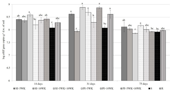 The copy numbers of the alkH gene detected in the soils allowed the estimation of the influence of the introduced strains on the numbers of bacteria able to degrade aliphatic hydrocarbons (Figure 3). One-way ANOVA and Tukey’s tests p < 0.05 were performed to evaluate the differences between the numbers of the alkH gene on days 14, 31 and 75. Nonsignificant differences were observed between noninoculated soils without (R) and with plants (S) on days 14 and 75. On day 14, similar to 16S rRNA gene numbers, the significant differences were observed in the amount of the alkH gene between soil with consortium inoculation (SI + 5WK + 10WK; PI + 5WK + 10WK) and soil without bacterial strain introduction (S). On day 31, no significant differences were observed between SI + 5WK + 10WK; PI + 5WK + 10WK and S treatment. Furthermore, nonstatistically important results were observed with single strain introduction (SI + 5WK; SI + 10WK; PI + 5WK; PI + 10WK) compared to planted soil (R). Moreover, the numbers of the alkH gene in all treatments at the end of the experimental period (75 days) were similar.