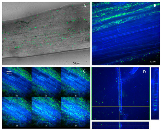 The main objective of this part of the study was to confirm the endophytic nature of the 5WK strain. This experiment allowed us to detect the site and the route of colonization by Rhizobium sp. 5WK. Twenty-four hours after inoculation, the gfp-tagged 5WK abundantly colonized the root surface of L. perenne seedlings (Figure 4A,C). Interestingly, gfp-Rhizobium sp. 5WK was also detected inside root hairs of L. perenne (Figure 4D). Furthermore, it is important to mention that the root conductive tissues were also colonized with significant numbers of tagged-bacteria (Figure 4B).