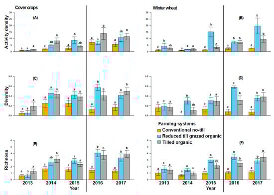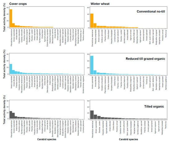- Rivers, A.; Mullen, C.; Wallace, J.; Barbercheck, M. Cover crop-based reduced tillage system influences Carabidae (Coleoptera) activity, diversity and trophic group during transition to organic production. Renew. Agric. Food Syst. 2017, 32, 538–551. [Google Scholar] [CrossRef]