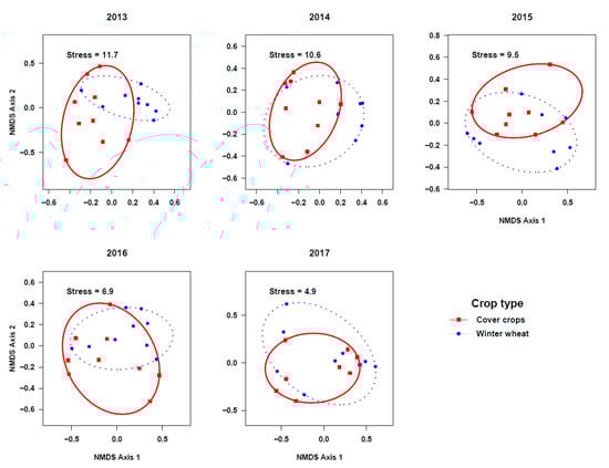 - Jabbour, R.; Pisani-Gareau, T.; Smith, R.G.; Mullen, C.; Barbercheck, M. Cover crop and tillage intensities alter ground-dwelling arthropod communities during the transition to organic production. Renew. Agric. Food Syst. 2016, 31, 361–374. [Google Scholar] [CrossRef]