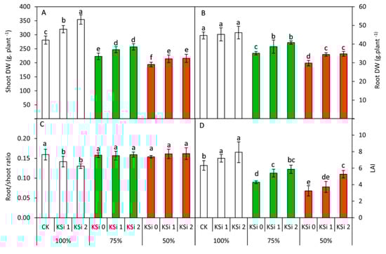 Shoot dry weight (A), root dry weight (B), root/shoot ratio (C) and leaf area index (LAI) (D) of the maize plants at 80 days after sowing (DAS) as influenced by the foliar application of K2SiO3 (0, 1 and 2 mM) under three irrigation regimes: 100% (white), 75% (green) and 50% (orange) of water requirements. CK: well-watered control, KSi 0: K2SiO3-untreated plants, KSi 1: K2SiO3 (1 mM) and KSi 2: K2SiO3 (2 mM). Data of the two seasons of 2018 and 2019 were subjected to combined analysis. Means were presented ± SD. Different letters are significant differences, according to Duncan’s multiple range tests (p < 0.05).
