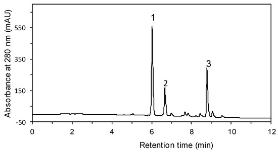 Phenolic compounds of Jerusalem artichoke tuber extracts were separated using a high-performance liquid chromatography (HPLC) Shimadzu system (Shimadzu, Kyoto, Japan), which consisted of a CBM-20A controller, a DGU-20A5R degassing unit, two LC-30AD pumps, a SIL-30AC autosampler, an SPD-M30A diode array detector and a CTO-20AC column oven. Aliquots of 10 μL of extract solutions in 80% (v/v) methanol were injected into a Luna C8 (2) column (4.6 × 150 mm, particle size 3 μm, Phenomenex, Torrance, CA, USA). The compounds were eluted in a linear gradient system of solvents A (acetonitrile-water-trifluoroacetic acid, 5:95:0.1, v/v/v) and B (acetonitrile-trifluoroacetic acid, 100:0.1, v/v) [33,34]: 0–18 min, 0%–60% B. The flow rate was 1 mL/min, and the oven temperature was 25 °C. Detection was carried out by scanning over a wavelength range from 200 to 400 nm. The contents of individual phenolic compounds were expressed on the basis of the calibration curves of the corresponding standards or structurally related substances.
