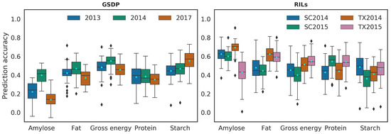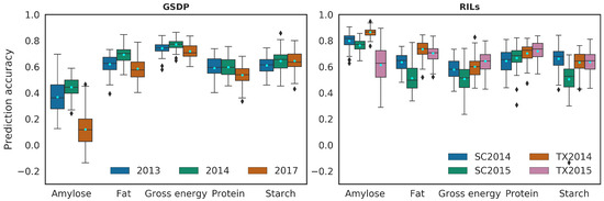 In order to assess predictability by location or year in the RILs, we tested one location or year by training the BMORS model using the other location or year, respectively (Table 4). The Texas location had higher accuracy of prediction for fat (+0.11) and gross energy (+0.1) compared to South Carolina, but rest of the traits had similar prediction accuracy (difference < 0.02). Prediction accuracy of whole years varied across traits, amylose (+0.09) and fat(+0.04) were higher in 2014, protein was higher (+0.05) in 2015, and starch and gross energy were similar.
