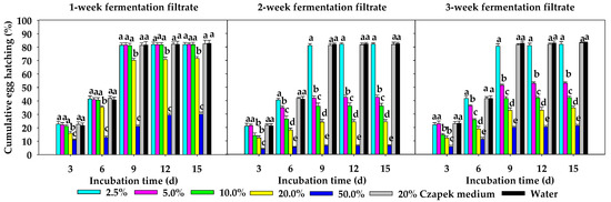 Cumulative Meloidogyne incognita eggs hatching rates in Aspergillus japonicus ZW1 fermentation filtrate. The bars represent the standard error. The same letter is not significantly different (p < 0.05) according to a Fisher’s protected least significant difference (LSD) test.