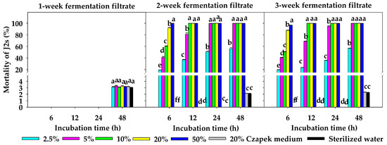 The mortality of Meloidogyne incognita J2s in Aspergillus japonicus ZW1 fermentation filtrate. Means with the same letter in each group designate no significant differences (p < 0.05) based on analysis with a Fisher’s protected LSD test.