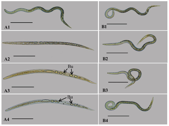 Morphology of second-stage juveniles of Meloidogyne incognita treated with 10% 2-week fermentation filtrate (2-WF) of Aspergillus japonicus ZW1. A1–A4 were treated with 10% 2-WF; B1–B4 were treated with sterilized water; A1 and B1 were treated at 0 h; A2 and B2 were treated at 6 h; A3 and B3 were treated at 12 h; and A4 and B4 were treated at 24 h. Bu: bubbles. Scale bars of A1–A4 and B1–B4 were 100 μm.