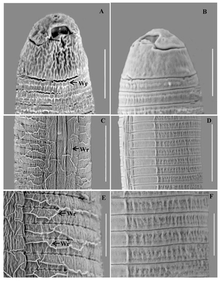 Visualization of the effect of 10% 2-WF of Aspergillus japonicus ZW1 on the morphology of Meloidogyne incognita J2s with scanning electron microscopy. (A,C,E) J2s treated with 10% 2-WF. (B,D,F) J2s treated with sterilized water. (A,B) Head region of J2. (C–F) The lateral field of J2. Scale bars of (A,B,E,F) and (C,D) were 2 and 5 μm, respectively. Wr: protruded wrinkles (black arrow).