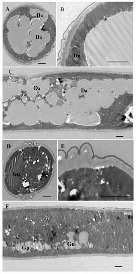 Cross-sections of Meloidogyne incognita J2 treated with 10% 2-WF of Aspergillus japonicus ZW1. (A–C) J2s treated with A. japonicus ZW1 fermentation filtrate. (D–F) J2s treated with sterilized water. Scale bars of A, B, C, D, E, and F were 2 μm. Da: damaged and area. Gu: gut. Dn: destructed nuclei.