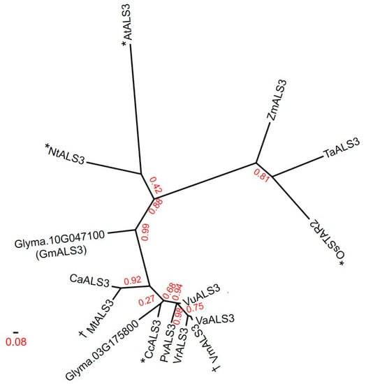 3.4. Protein Sequence and Phylogenetic Analyses for the Identification of GmALS3 Orthologs in Other Crops