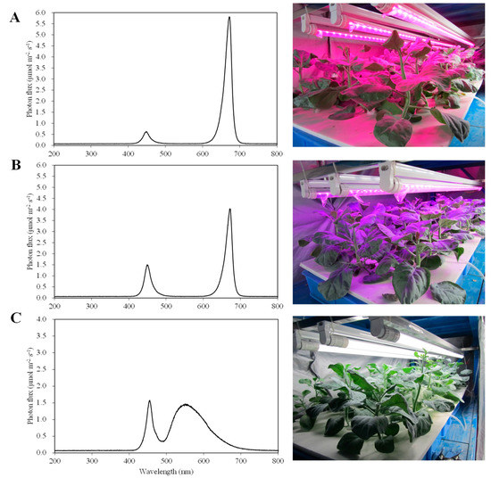 Spectral profiles of the LED lights ((A) 8R1B, red:blue = 8: 1, (B) 6R3B, red:blue = 6:3), and (C) white LED light (control) used in this study. Photosynthetic photon flux integration for each light treatment were equal to 120 ± 10 μmol·m−2·s−1.