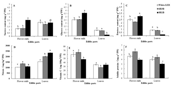 In Chinese kale, flower stalks contained less nitrate than leaves (Figure 2D). The nitrate content of Chinese kale in 8R1B and 6R3B treatment were significantly higher than those under white LED both in flower stalks and leaves. Under a higher proportion of red light treatment, there were lower nitrate and vitamin C content in flower stalks, while higher contents in leaves. Vitamin C content in flower stalks under 6R3B showed the same level as white LED (Figure 2E), while vitamin C content in leaf under 6R3B was significantly lower than other treatments. Both in flower stalks and leaves, the highest soluble protein content was observed under 6R3B, followed by white LED treatment, then 8R1B treatment (Figure 2F).