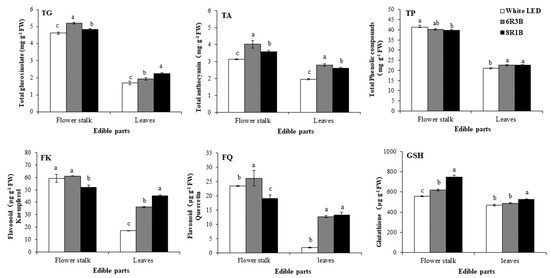 Health-promoting compounds in flower stalks and leaves of Chinese kale grown under different ratios of red:blue LED lights. TG, total glucosinolate; TA, total anthocyanin; TP, total phenolic; FK, flavonoid kaempferol; FQ, flavonoid quercetin; GSH, Glutathione. Different letters indicate significant differences between treatments by Duncan’s multiple range test (p ≤ 0.05).