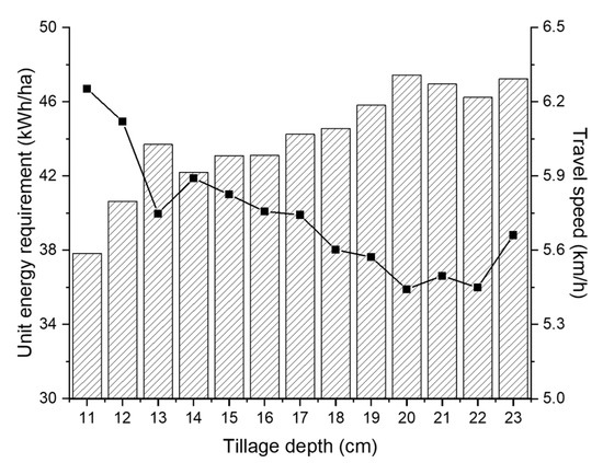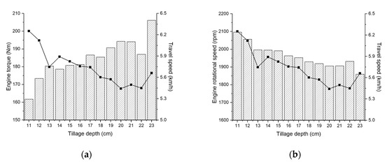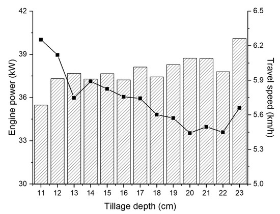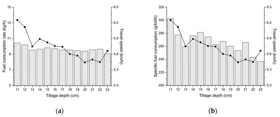 14]; the results showed that fuel consumption during the tillage operation can be minimized by selecting an engine speed that is approximately 70%–80% of the rated speed. Tillage depth has a considerable influence on the mechanical aspects of a tractor such as its load and required power [