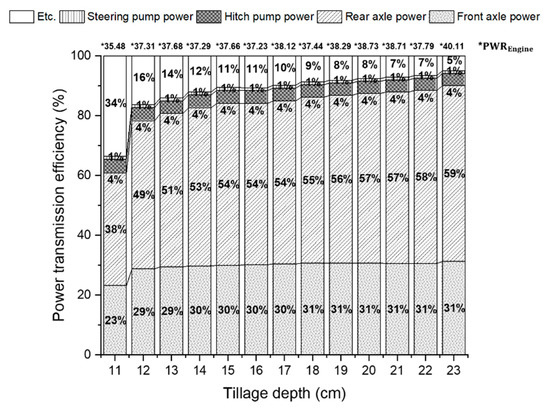 51]. Through this, it was confirmed that the increase of most power transmission efficiency is achieved by the increase of power requirements in the wheel axle. In particular, as the tillage depth increased from 11 cm to 23 cm, the engine power increased from 35.48 kW to 40.11 kW by about 13% or more, but it was confirmed that the power transmission in each major part increased significantly. The power transmission efficiency with respect to engine power requirements according to tillage depth is shown in
