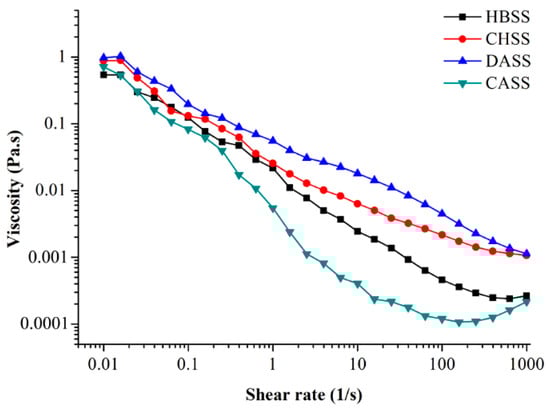 Four kinds of MLPs at 1% concentration showed different rheological behaviors at 20 °C as shown in Figure 1. The apparent viscosity of samples was observed in the following order: DASS > CHSS > HBSS > CASS. The obtained curves declined over the range of 0.01–1000 s−1 and showed different behaviors. MLPs solutions had almost similar apparent viscosity at a low shear rate; whereas, apparent viscosity of HBSS and CASS displayed a slight increase at 100–1000 s−1. Our results confirm that these two MLPs fractions can be used as novel commercial gum materials due to their high viscosity. In addition, the apparent viscosity of DASS was higher than other members, which demonstrated that DASS was better used as thickening agents in the food industry.